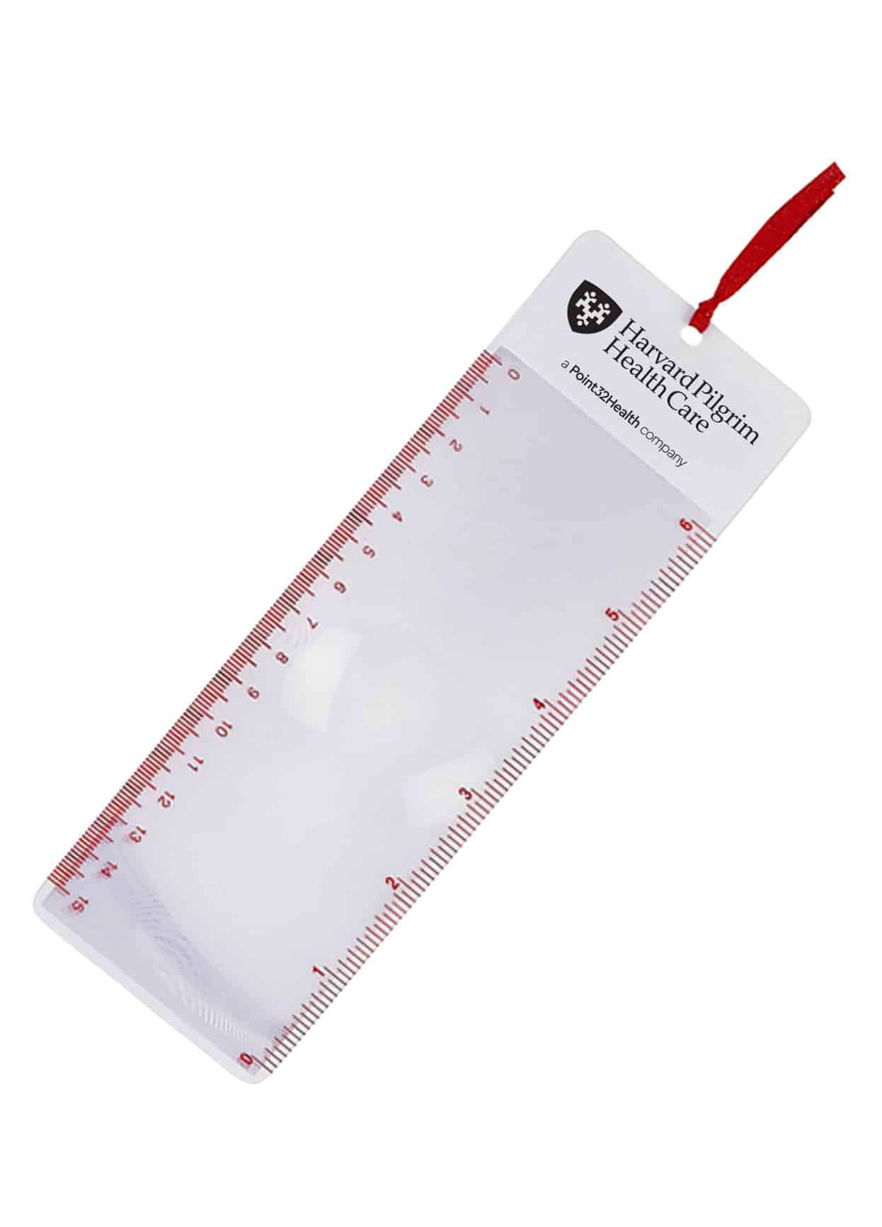 The magnifier has 4X magnification, the ribbon color matches the measurement markings, and the ruler measures up to 6 inches or 15 centimeters
