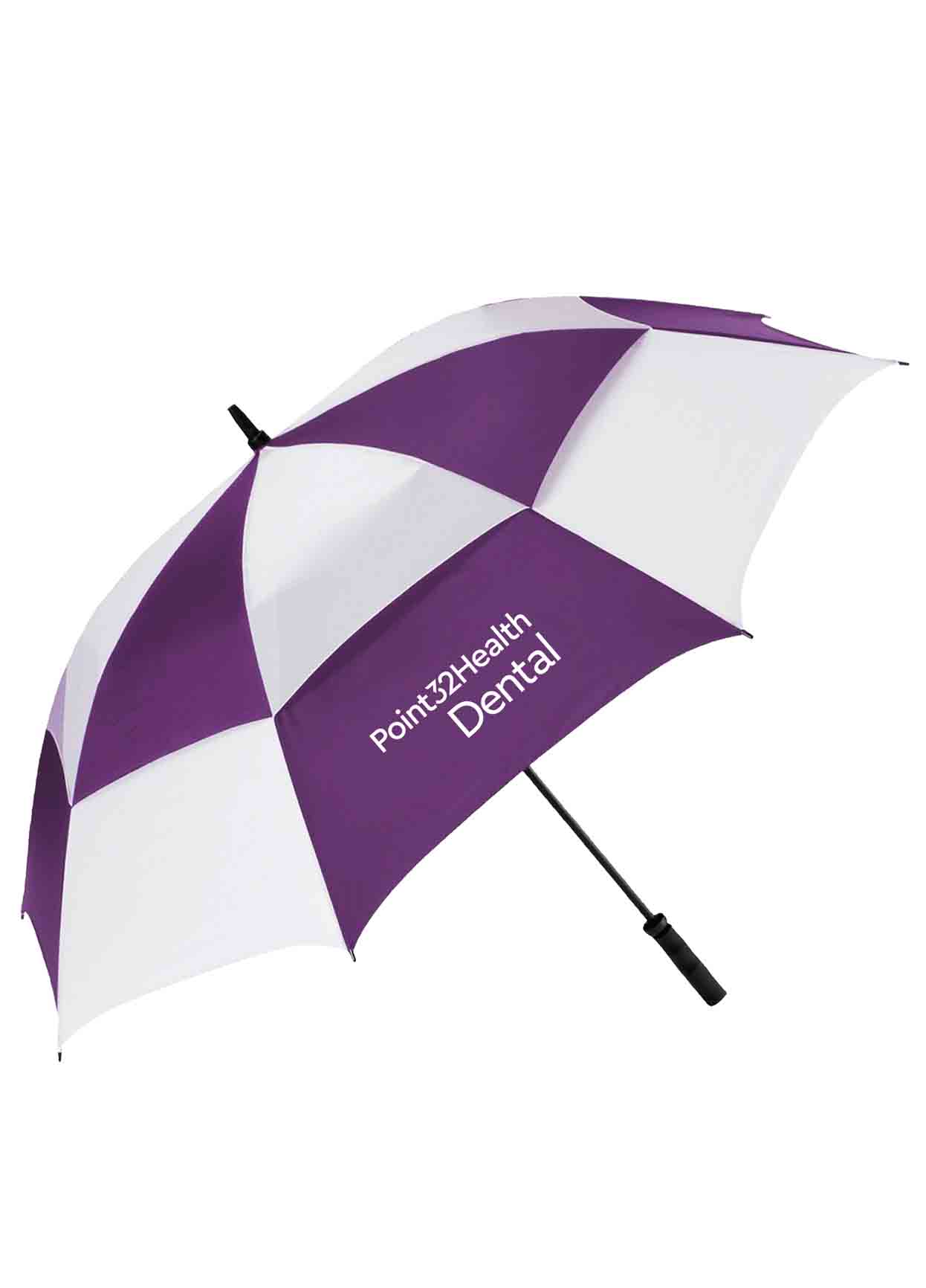 The ultimate golf umbrella for wind and rain! Designed to withstand wind gusts up to 60 mph, featuring vented canopy technology which helps secure the umbrella by reducing air resistant in strong wind gusts. Made of nylon with a 62″ arc, fiberglass shaft and Duraflex (TM) fiberglass ribs, a black rubber spray pistol grip handle and matching nylon sleeve.
